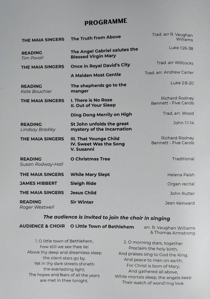 The Maia Singers sang Pastime with good company – Anon, The Londonderry Air – Arranged Bob Cholcott and I got Plenty o’ nuttin’ – Gershwin.